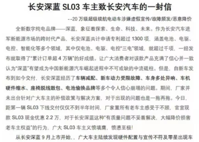 正如文章开篇提到,长安深蓝SL03车主集体向长安汽车公开发出维权信,反应深蓝SL03有关虚假宣传、故障频发以及恶意降价等行为,并表示相关故障严重影响车辅的驾驶安全和驾驶体验,极有可能造成严重的交通事故,给车主和其它道路交通的参与者带来了极大的安全隐患。