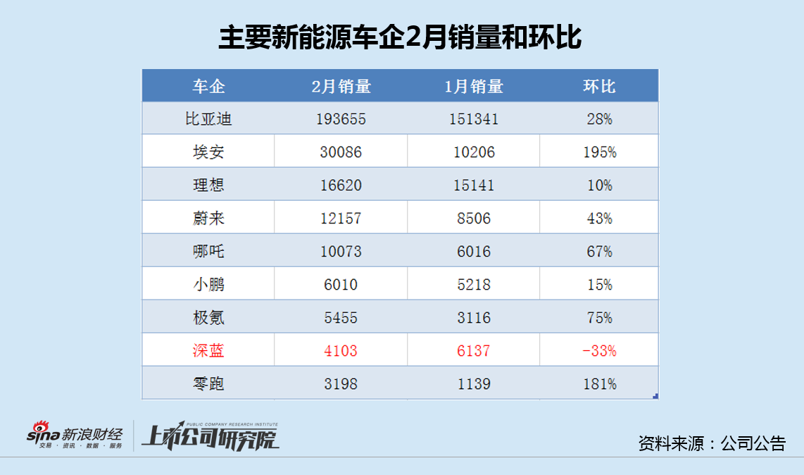 今年春节过后的2月份,深蓝月销4103辆,环比1月下降33%,不仅销量在新能源车企中位列倒数,也是唯一一家环比下滑的主要新能源品牌。