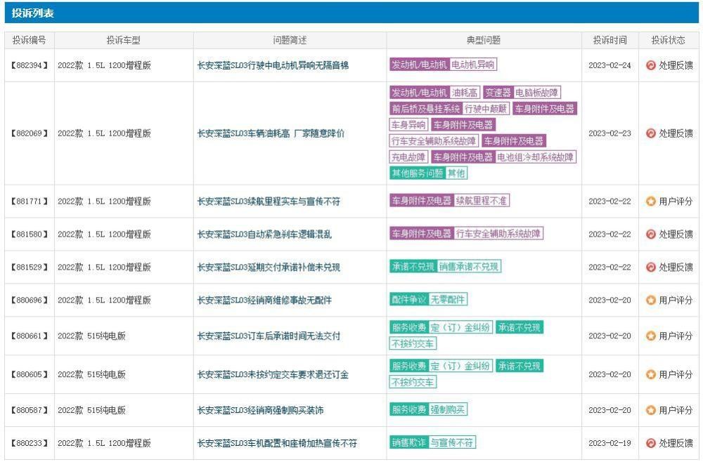 例如,从车质网投诉平台不难看到,有关深蓝SL03的投诉,除了不按约交车、定金纠纷、销售隐瞒相关信息之外,还普遍存在影音系统故障、空调问题、车内异响等质量问题。