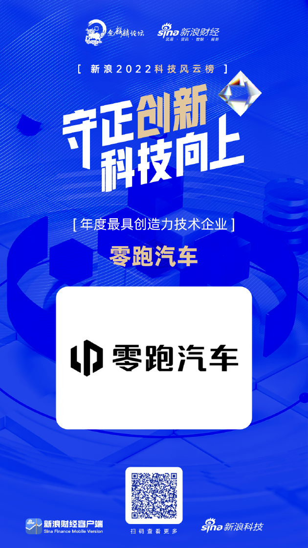 其中,零跑汽车获得新浪2022科技风云榜——年度最具创造力技术企业奖项。
